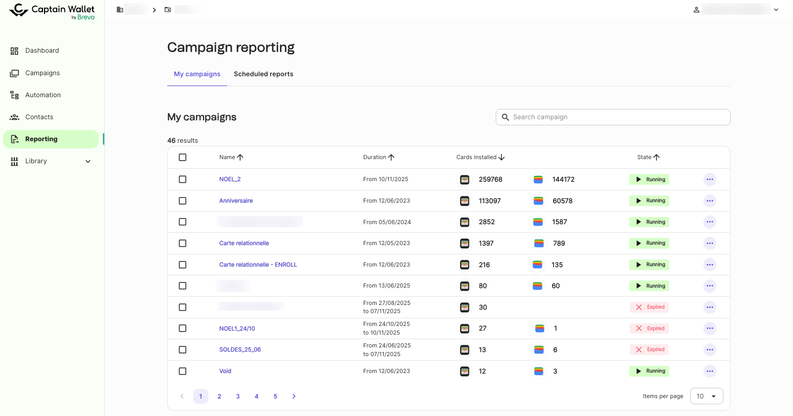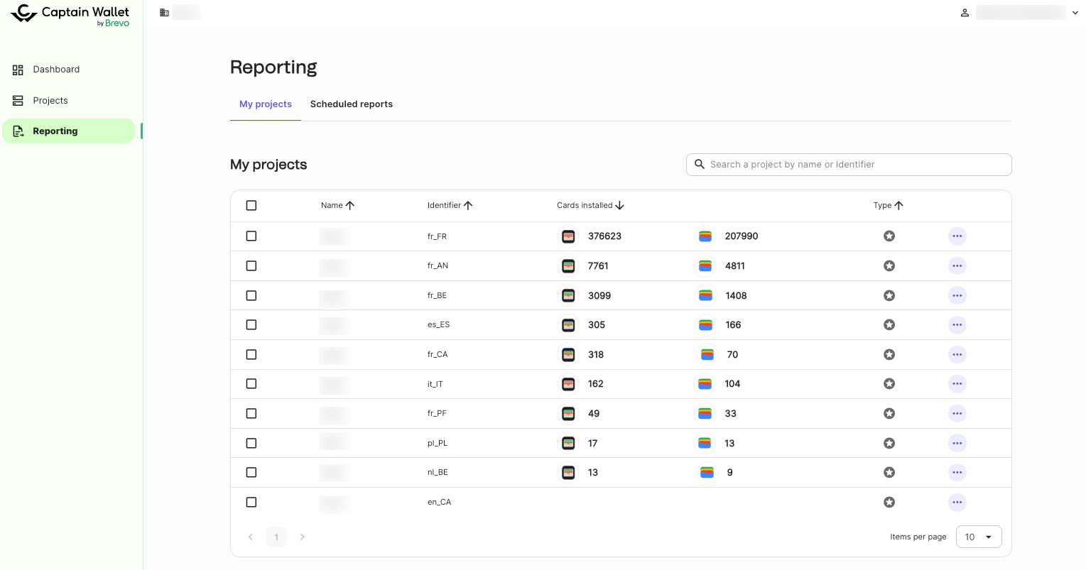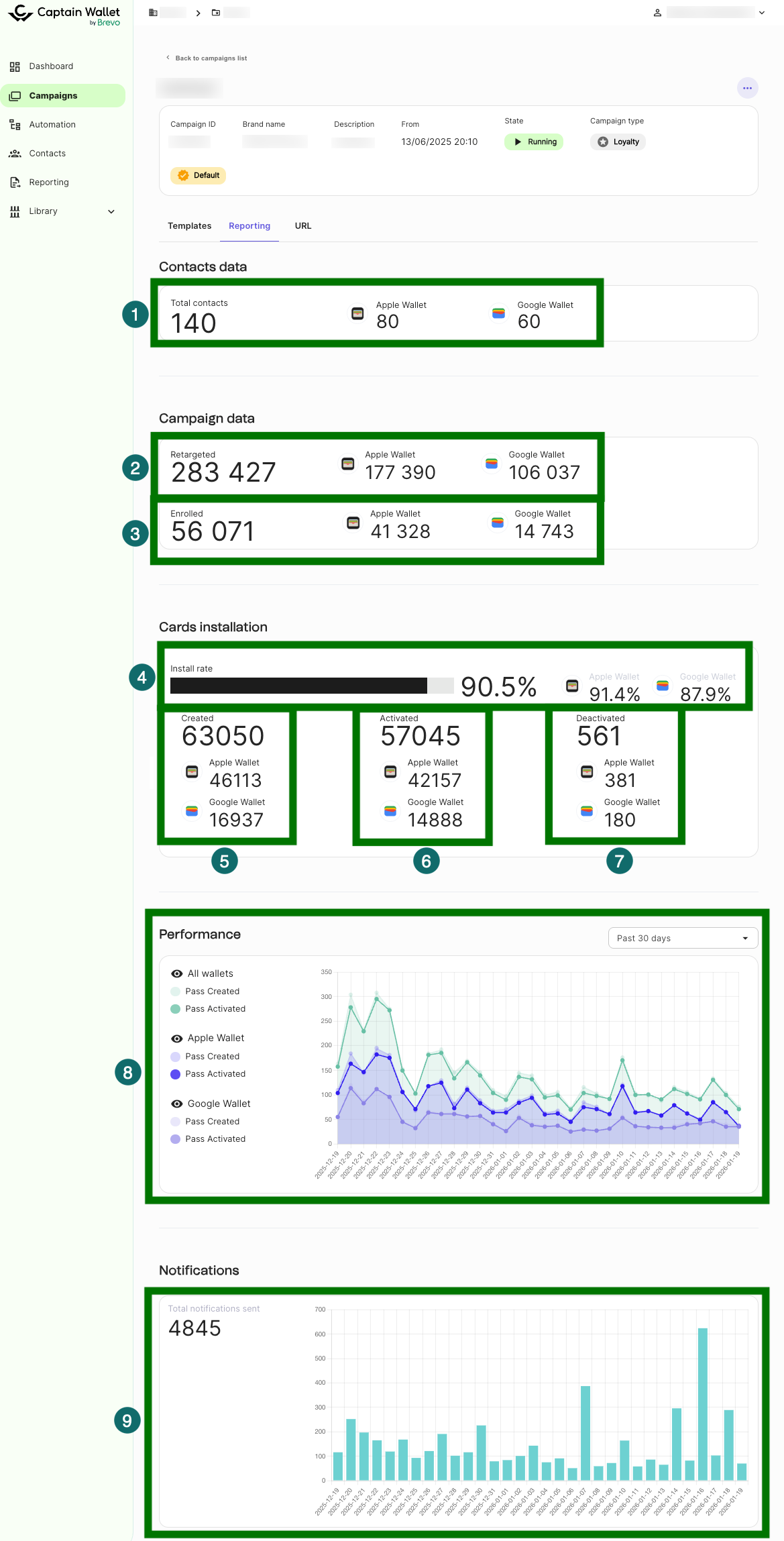 Monitor your Wallet performance using dashboards and data The Wallet platform provides several dashboards and reporting views to help you monitor your wallet performance and track key metrics. Learn how to access and interpret the data across the different dashboard views available in the Wallet platform.ποΈ Wallet dashboards overviewPerformance tracking is available in several views within the Captain Wallet platform: Project dashboard: provides a global view of your project's activity Campaign dashboard: displays performance metrics for a specific campaign Account dashboard: shows activity across all projects in your account (multi-project view) Reporting section: provide access to an overview of activity by campaign, a list of all campaigns, and the option to generate exports. βΉοΈ About the Wallet dashboardsπ Time period selectionMost dashboards allow you to select different time periods to analyze your data: Last 7 days Last 30 days Last 3 months Last 6 months Last 1 year Custom Date The time period selection affects how data is aggregated in graphs and the calculation of growth metrics.π Key definitions to understand Wallet metricsπ€ User status Active user: a user with at least one installed card Inactive user: a user with no installed cards πͺͺ Card statesCards move through different states during the user lifecycle: Created: the user clicked the wallet call-to-action, and the card was generated on the platform (no active card in the wallet at this stage) Downloaded: the card was downloaded to the user's device, but not yet installed Installed: the card is installed on one or more devices, and the user becomes active (The customer can therefore be notified, and their card can be updated) Deleted: the card is removed from one or more user devices Uninstalled: the card is deleted from all user devices, and the user becomes inactive π EventsThe platform tracks three main events: Card created: a card was generated for a user Card installed: a card was installed for the first time by a user Card deleted: a card was uninstalled by a user (the user becomes inactive) Asynchronous indicatorsSome metrics are marked as [ASYNC], meaning they are calculated in the background every 2 minutes rather than in real-time. This improves dashboard performance, especially for accounts with large volumes of data. π° VendorTo associate the platform (vendor) with a user, we take the vendor of their first active pass.ποΈ Project dashboard metrics Total users [ASYNC]Number of unique active users to date. Total users by platform [ASYNC]Number of active users by vendor (Apple Wallet or Google Wallet). The vendor is determined by the user's first active pass. Total users by loyalty status [ASYNC]Number of active users broken down by loyalty status (if set up on the project). Customer growth in volume [ASYNC]Active users today minus active users at the beginning of the selected period (7 days, 30 days, 3 months, 6 months, 1 year, or custom date). Customer growth in percentage [ASYNC]Formula: (Active users today - Active users at start of period) / Active users at start of period Total users by platform - graph [ASYNC]Visual representation of active users by platform over time: 7 and 30-day periods: daily breakdown 3 and 6-month periods: weekly breakdown 1-year period: monthly breakdown (end of month) Card creation and installationNumber of cards created and installed over time, displayed with the same time breakdown as in 6. NotificationsNumber of notifications sent during the selected time period (including all notifications, whether one-time or automated) π³ Campaign dashboard metrics Total users [ASYNC] Total number of active users to date, on this campaign, and by vendor. Total retargeted users Number (total and by vendor) of unique users who are active (or have been active) from a previous campaign and targeted by the campaign (cannot decrease). Total enrolled users Number (total and by vendor) of active users (or have been active) whose first installation occurred through this campaign. This number cannot decrease. Installation rate Formula: Installed cards / Created cards on the campaign. Global installation rate + by vendor Card creation events Number (total and by vendor) of card creation events received on the campaign by unique user. Card installation events Number (total and by vendor) of card installation (activation) events received on the campaign by unique user. Card uninstallation events Number (total and by vendor) of card uninstallation events received on the campaign by unique user. π‘ Good to know This can be higher than inactive users in reports if you reinstall cards after deleting them. Creation and installation graph Visual representation of cards created and installed over time - in total and by vendor: 7 and 30-day periods: daily breakdown 3 and 6-month periods: weekly breakdown 1-year period: monthly breakdown Notifications graph Number of notifications sent targeting this campaign, over the selected time period π€ Account dashboard metrics (multi-project view) Total users [ASYNC]Number (total and by vendor) of active users to date across all projects. The vendor is determined by the user's first active pass. Customer growth in volume [ASYNC]Active users today minus active users at the beginning of the selected period, across all projects. Customer growth in percentage [ASYNC]Formula: (Active users today - Active users at start of period) / Active users at start of period, across all projects. Total users by platform - graph [ASYNC]Visual representation of active users by platform over time across all projects: 7 and 30-day periods: daily breakdown 3 and 6-month periods: weekly breakdown 1-year period: monthly breakdown π About the reporting sectionπ€ Account reporting sectionTotal users by platform and projects [ASYNC]Number of active users to date, broken down by platform and projects.π€ Projects reporting sectionTotal users by platform and camp