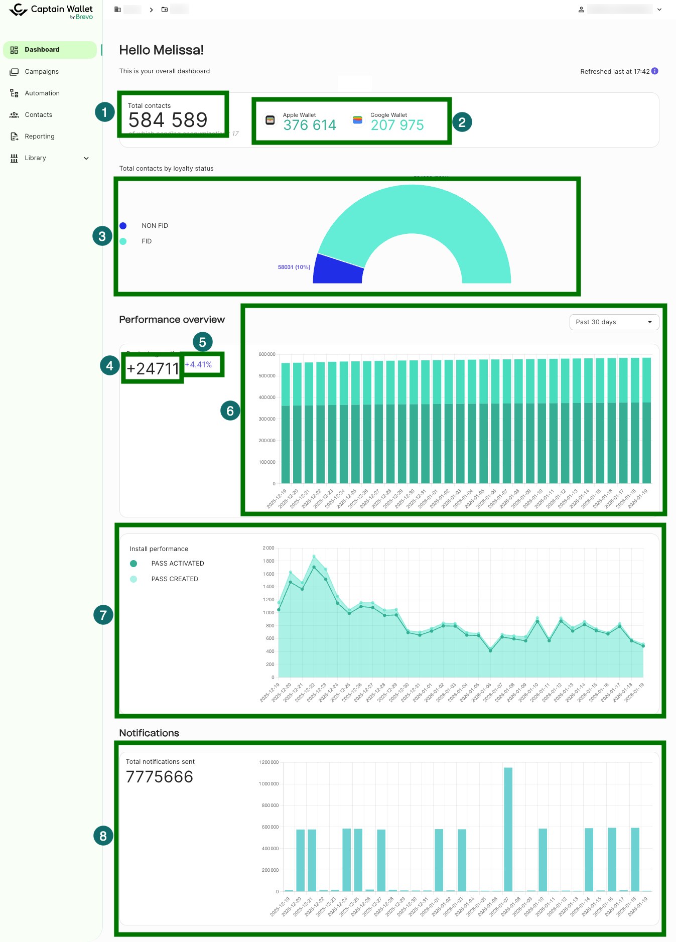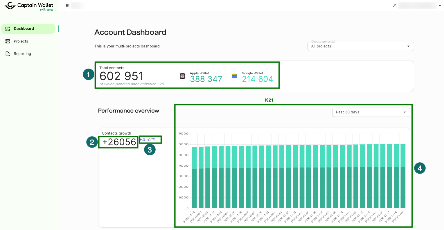 Suivre les performances de votre Wallet à l'aide de tableaux de bord et de données La plateforme Wallet fournit plusieurs tableaux de bord et vues de reporting pour vous aider à surveiller les performances de votre wallet et à suivre les indicateurs clés. Apprenez comment accéder et interpréter les données à travers les différentes vues de tableau de bord disponibles dans la plateforme Wallet.👁️ Vue d'ensemble des tableaux de bord WalletLe suivi des performances est disponible dans plusieurs vues au sein de la plateforme Captain Wallet : Tableau de bord du projet : fournit une vue globale de l'activité de votre projet Tableau de bord de campagne : affiche les métriques de performance pour une campagne spécifique Tableau de bord du compte : montre l'activité sur tous les projets de votre compte (vue multi-projets) Section de reporting : fournit un accès à une vue d'ensemble de l'activité par campagne, une liste de toutes les campagnes, et l'option de générer des exports. ℹ️ À propos des tableaux de bord Wallet🕑 Sélection de la périodeLa plupart des tableaux de bord vous permettent de sélectionner différentes périodes pour analyser vos données : 7 derniers jours 30 derniers jours 3 derniers mois 6 derniers mois Dernière année Date personnalisée La sélection de la période affecte la façon dont les données sont agrégées dans les graphiques et le calcul des métriques de croissance.🔑 Définitions clés pour comprendre les métriques Wallet👤 Statut de l'utilisateur Utilisateur actif : un utilisateur avec au moins une carte installée Utilisateur inactif : un utilisateur sans carte installée 🪪 États de la carteLes cartes passent par différents états au cours du cycle de vie de l'utilisateur : Créée : l'utilisateur a cliqué sur l'appel à l'action wallet, et la carte a été générée sur la plateforme (pas de carte active dans le wallet à ce stade) Téléchargée : la carte a été téléchargée sur l'appareil de l'utilisateur, mais pas encore installée Installée : la carte est installée sur un ou plusieurs appareils, et l'utilisateur devient actif (Le client peut donc être notifié, et sa carte peut être mise à jour) Supprimée : la carte est retirée d'un ou plusieurs appareils utilisateurs Désinstallée : la carte est supprimée de tous les appareils utilisateurs, et l'utilisateur devient inactif 🎉 ÉvénementsLa plateforme suit trois événements principaux : Carte créée : une carte a été générée pour un utilisateur Carte installée : une carte a été installée pour la première fois par un utilisateur Carte supprimée : une carte a été désinstallée par un utilisateur (l'utilisateur devient inactif) Indicateurs asynchronesCertaines métriques sont marquées comme [ASYNC], ce qui signifie qu'elles sont calculées en arrière-plan toutes les 2 minutes plutôt qu'en temps réel. Cela améliore les performances du tableau de bord, en particulier pour les comptes avec de gros volumes de données. 💰 VendorPour associer la plateforme (vendor) avec un utilisateur, nous prenons le vendor de son premier pass actif.🗂️ Métriques du tableau de bord du projet Total des utilisateurs [ASYNC]Nombre d'utilisateurs actifs uniques à ce jour. Total des utilisateurs par plateforme [ASYNC]Nombre d'utilisateurs actifs par vendor (Apple Wallet ou Google Wallet). Le vendor est déterminé par le premier pass actif de l'utilisateur. Total des utilisateurs par statut de fidélité [ASYNC]Nombre d'utilisateurs actifs répartis par statut de fidélité (si configuré sur le projet). Croissance de la clientèle en volume [ASYNC]Utilisateurs actifs aujourd'hui moins les utilisateurs actifs au début de la période sélectionnée (7 jours, 30 jours, 3 mois, 6 mois, 1 an, ou date personnalisée). Croissance de la clientèle en pourcentage [ASYNC]Formule : (Utilisateurs actifs aujourd'hui - Utilisateurs actifs au début de la période) / Utilisateurs actifs au début de la période Total des utilisateurs par plateforme - graphique [ASYNC]Représentation visuelle des utilisateurs actifs par plateforme au fil du temps : Périodes de 7 et 30 jours : répartition quotidienne Périodes de 3 et 6 mois : répartition hebdomadaire Période d'1 an : répartition mensuelle (fin de mois) Création et installation de cartesNombre de cartes créées et installées au fil du temps, affichées avec la même répartition temporelle que le 6. NotificationsNombre de notifications envoyées pendant la période sélectionnée (incluant toutes les notifications, qu'elles soient ponctuelles ou automatisées) 💳 Métriques du tableau de bord de campagne Total des utilisateurs [ASYNC] Nombre total d'utilisateurs actifs à ce jour, sur cette campagne, et par vendor. Total des utilisateurs reciblés Nombre (total et par vendor) d'utilisateurs uniques qui sont actifs (ou ont été actifs) depuis une campagne précédente et ciblés par la campagne (ne peut pas diminuer). Total des utilisateurs inscrits Nombre (total et par vendor) d'utilisateurs actifs (ou ont été actifs) dont la première installation s'est produite via cette campagne. Ce nombre ne peut pas diminuer. Taux d'installation Formule : Cartes installées / Cartes créées sur la campagne. Taux d'installation global + par vendor Événements de création de carte Nombre (total et par vendor) d'événements de création de carte reçus sur la campagne par utilisateur unique. Événements d'installation de carte Nombre (total et par vendor) d'événements d'installation (activation) de carte reçus sur la campagne par utilisateur unique. Événements de désinstallation de carte Nombre (total et par vendor) d'événements de désinstallation de carte reçus sur la campagne par utilisateur unique. 💡 Bon à savoir Cela peut être supérieur aux utilisateurs inactifs dans les rapports si vous réinstallez des cartes après les avoir supprimées. Graphique de création et d'installation Repr